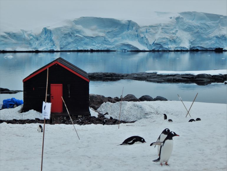 W maleńkiej bazie brytyjskiej w Port Lockroy (gdzie znajduje się przytulne muzeum i świetnie wyposażony sklepik) poznałam „tegoroczny” personel, złożony z 5 pracowników. Na Antarktydę trafili w listopadzie, na początku polarnego lata, zostaną do marca. W zimie ta konkretna stacja będzie zamknięta (te większe, jak Arctowski są całoroczne), ale póki co maja ręce pełne roboty: podczas jednego sezonu odwiedzi ich prawie 18 tys turystów (tylu obecnie trafia na Antarktydę co roku). W Port Lockroy funkcjonuje także pełnoprawny oddział brytyjskiej poczty, więc można wysłać pocztówkę, która statkiem popłynie na Falklandy-Malvinas, stamtąd do Londynu, skąd roześlą je do „reszty świata”. Dziewczyna z Anglii ogarnia codziennie obowiązki pocztowe, a młody chłopak z Francji zajmuje się sklepikiem i… codziennie liczy pingwiny, bowiem dookoła zabytkowego drewnianego budynku jest sporych rozmiarów kolonia pingwinów Gentoo. Grupie przewodzi młoda Holenderka, Heidi. Zapytałam ich jak to się stało, że trafili do Port Lockroy, czy mieli jakieś konkretne doświadczenie zawodowe, które sprawiło, ze dostali tę pracę. Ku mojemu zdziwieniu okazało się, że absolutnie nie, jest to bardzo przypadkowo dobrana ekipa odważnych ludzi, którym marzą się przygody i nie boją się spędzić 6 długich miesięcy na śmierdzącej pingwinią kupą wysepce. Heidi zajmowała się marketingiem, ale przybywała wcześniej w różnych odosobnionych placówkach w północnej Szkocji, a Guillaume (Francuz) od kilku lat już ima się różnych przypadkowych prac w odległych, dzikich terenach – czasem jest to wolontariat, czasem praca płatna jak w Port Lockroy, liczy się odwaga, wytrwałość i praktyczne umiejętności radzenia sobie z wyzwaniami życia w dzikiej głuszy.